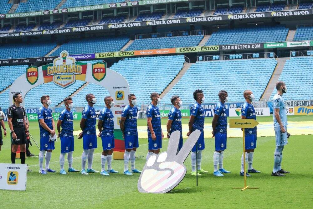 A partida do Grêmio contra o São Luiz, neste domingo, foi marcada por protesto pelo lado tricolor. Os atletas entraram em campo usando máscaras, antes da bola rolar. O jogo foi realizado com portões fechados em virtude da pandemia do coronavírus.