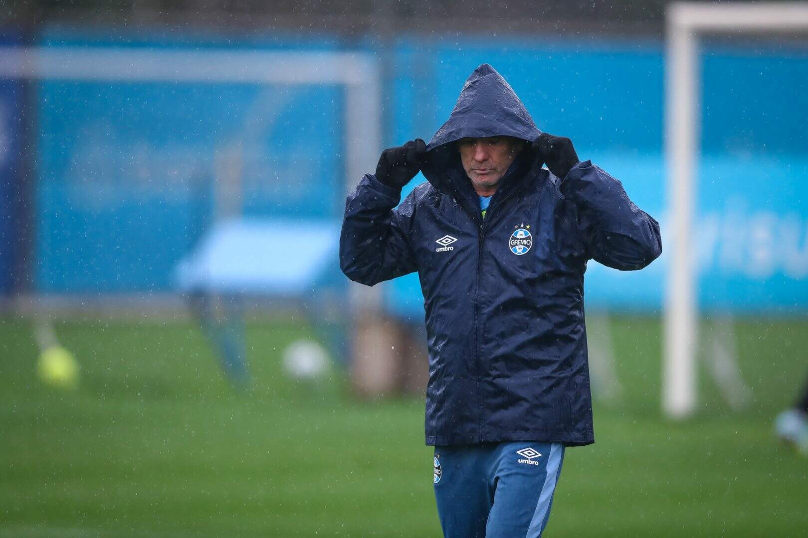 Sob chuva durante todo o trabalho da tarde desta quarta-feira (09), no CT Luiz Carvalho, o técnico Renato Portaluppi orientou os jogadores em exercícios variados