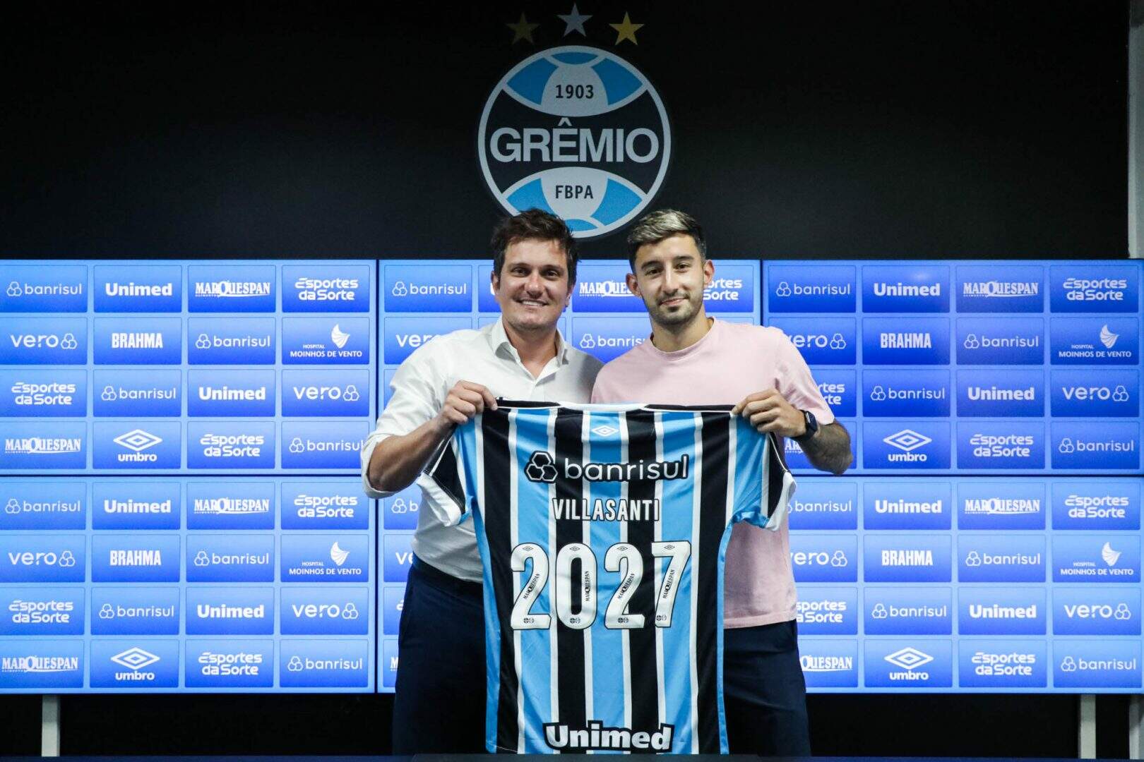 Foto: Renan Jardim/GrêmioO Grêmio oficializou, na manhã desta sexta-feira (2), a renovação de contrato com o volante Villasanti até o final de 2027. O ato da assinatura contou com as presenças do vice de futebol Antônio Brum e do executivo de futebol Luis Vagner Vivian.