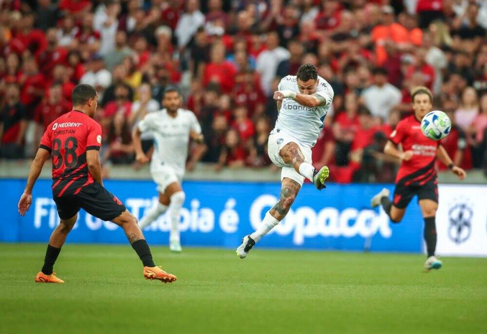 Com um minuto de jogo, o Athletico levou perigo à meta gremista. Vitor Roque recebeu cara a cara com Adriel e buscou o chute por cobertura, mas a bola foi direto para fora. Logo depois, o Tricolor respondeu. Aos dois, o ataque gremista, com Cuiabano e Galdino, tentou chegar, mas a defesa adversária afastou de dentro da pequena área e anulou a tentativa.