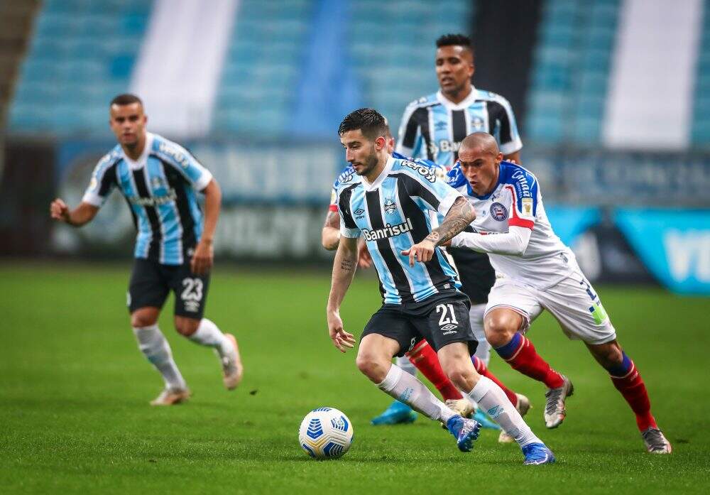 Depois de 15 minutos iniciais com domínio do Bahia, o Grêmio passou a ditar o ritmo em casa. Além de subir suas linhas de marcação, trocava passes para encontrar espaço na compacta defesa adversária.