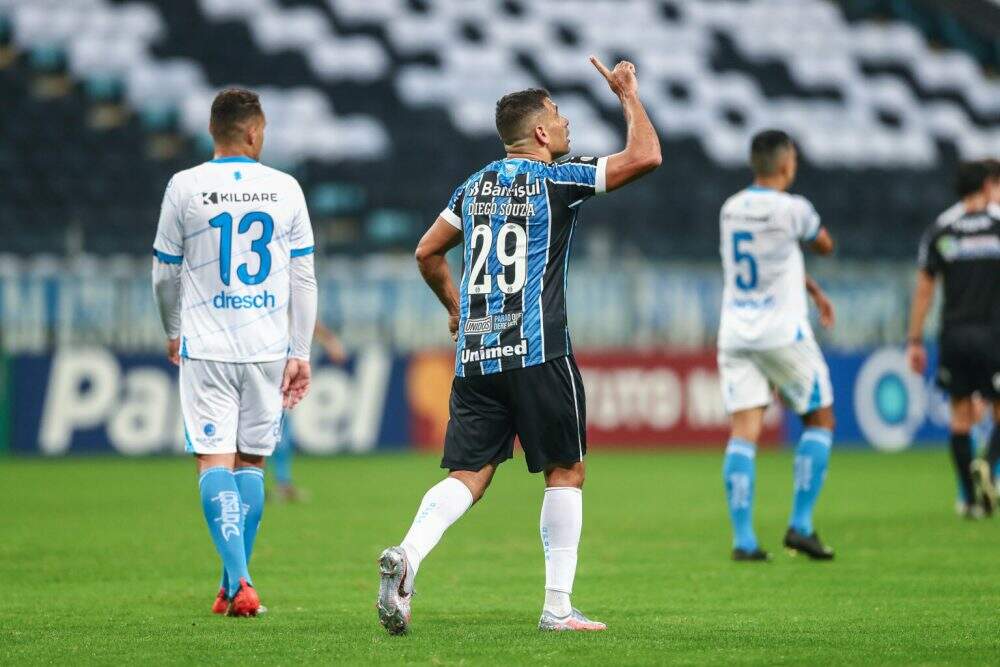 A segunda etapa começou sem trocas por parte dos treinadores e novamente com um gol logo nos primeiros minutos, mas dessa vez anulado. Após cruzamento de Guilherme Guedes, Diego Souza cabeceia para o gol, mas o árbitro vê falta do atacante gremista em cima do zagueiro adversário. O tricolor pressionou, pressionou até que chegou ao gol e novamente com ele: Diego Souza! Guilherme Guedes cruzou rasteiro e o artilheiro tricolor desviou para o fundo das redes.