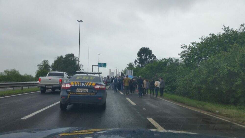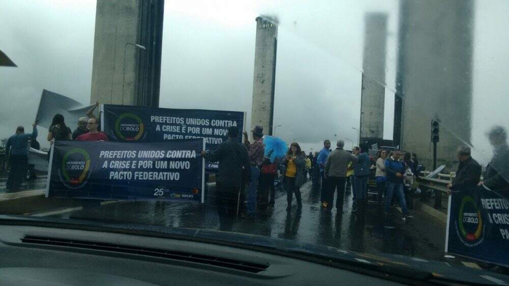 Um grupo de prefeitos e servidores de várias cidades do Estado realizou uma manifestação na manhã desta sexta-feira (25) na BR-290, sobre o vão móvel da ponte do Guaíba, em Porto Alegre. Com cartazes, eles reivindicavam um novo pacto federativo, com uma fatia maior na divisão de recursos entre União, Estado e municípios, além de chamar a atenção da sociedade sobre a crise financeira que enfrentam.