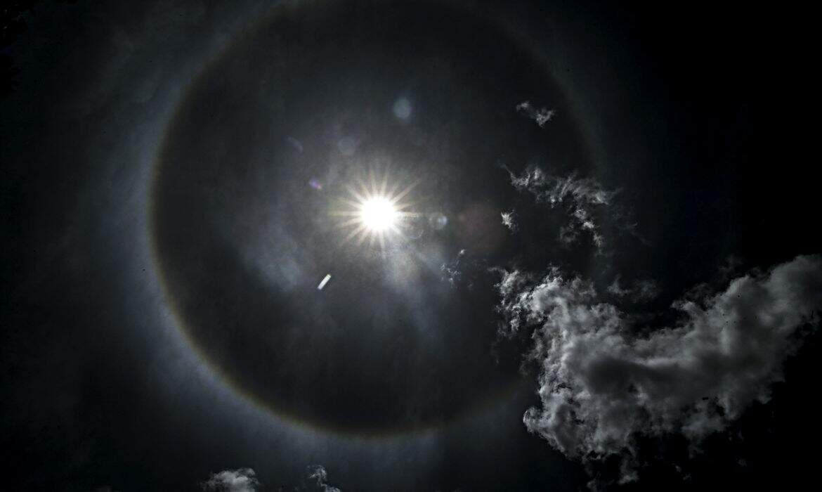 Foto: Marcello Casal Jr/Agência BrasilO céu de Brasília está diferente neste sábado (7). Diversas coincidências envolvendo nuvens formadas de cristais de gelo, localizadas a mais de 10 mil metros de altura, e a refração da luz solar possibilitaram a formação do chamado “halo solar” com as cores do arco-íris ao redor do grande astro.