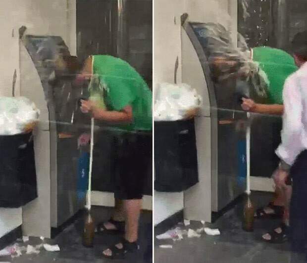 Um homem bêbado protagonizou uma cena hilária em um caixa eletrônico enquanto tentava sacar dinheiro no equipamento. O homem havia deixado uma garrafa de cerveja em cima do caixa, mas, no momento em que realizava a operação bancária, ele bateu e derrubou a garrafa.