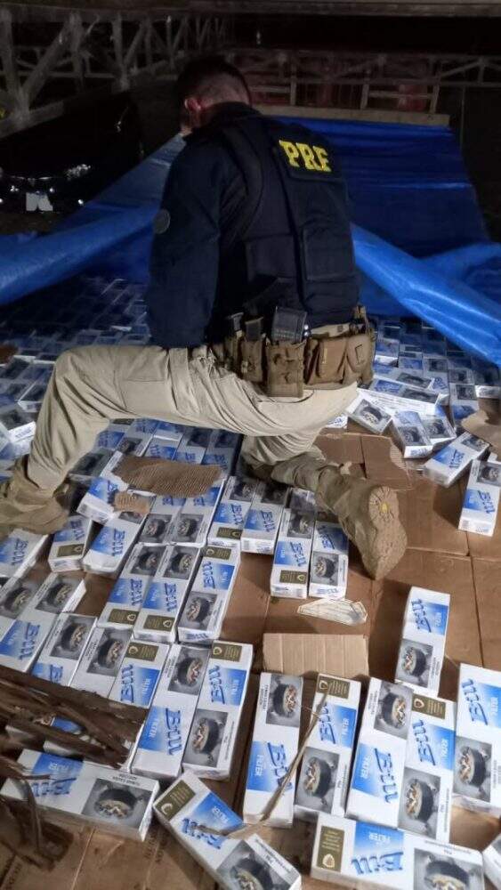 Durante ação de combate ao crime, os policiais rodoviários federais abordaram um caminhão M.Benz com placas de Curiuva/PR que transitava pela BR-287. Ao vistoriar o compartimento de carga, a equipe encontrou cerca de 72 mil maços de cigarros paraguaios contrabandeados. A mercadoria estava oculta embaixo de uma carga de paletes.