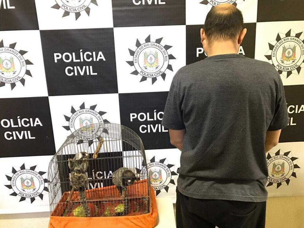 Um homem foi preso nesta quarta-feira (16) por crime de moeda falsa e posse de munição no bairro Vila Augusta, em Viamão, na Região Metropolitana de Porto Alegre. Agentes da Delegacia do Meio Ambiente chegaram ao suspeito após investigação relacionada à venda de animais silvestres em redes sociais. “No cumprimento da ordem judicial, além dos animais, foi encontrada munição calibre 22 e dinheiro falsificado, totalizando R$1600,00 em notas falsas”, relatou a delegada Marina Goltz,. Um sagui pincel preto, um sagui pincel branco e dois filhotes de sagui híbridos estavam em gaiolas.