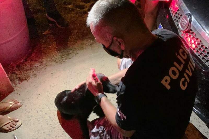 O cachorro sofreu ferimentos, mas passa bem. O animal foi resgatado e encaminhado para adoção.