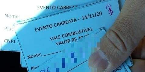 O efetivo da PRF flagrou o indivíduo distribuindo aos participantes de uma carreata os vales compras de combustível no posto de abastecimento na rodovia