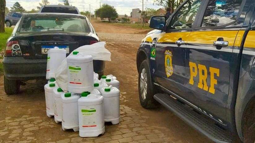 Policiais encontraram 400 litros de agrotóxicos contrabandeados durante uma operação conjunta de combate ao crime na BR 287. (Foto: PRF/Divulgação)