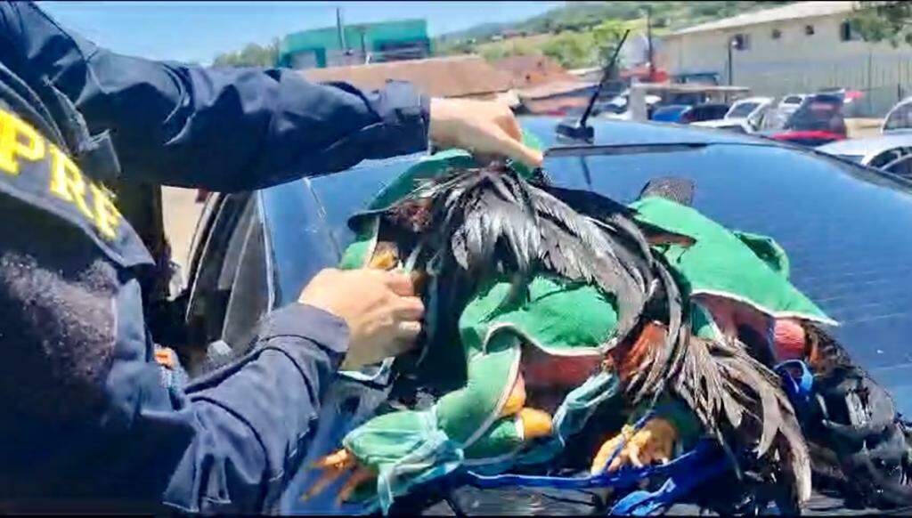 Foto: Divulgação/PRFA PRF (Polícia Rodoviária Federal) prendeu, na manhã desta terça-feira (12), um homem que transportava três galos de rinha. A ação ocorreu na BR-386, em Paverama, no Rio Grande do Sul, próximo à uma praça de pedágio.