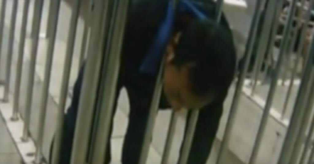Um chinês espertinho tentou um caminho alternativo para se livrar da multidão que saia de uma estação ferroviária na província de Jiangxi, na China, mas acabou entalando a cabeça entre as barras de uma grade de proteção. A cena bizarra foi registrada pelas câmeras de segurança da estação ferroviária. O homem foi libertado por agentes de segurança da estação. Apesar do susto, ele teve apenas ferimentos leves. (AG)