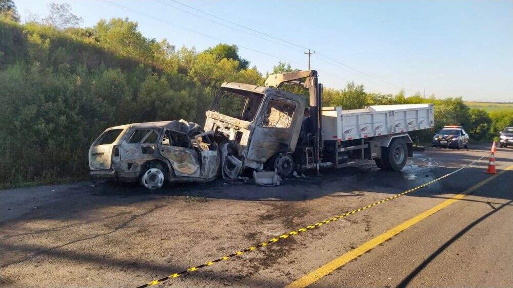 Um motorista de 73 anos morreu, na manhã desta sexta-feira (10), após colidir o seu automóvel Volkswagen Parati com três caminhões no quilômetro 214 da rodovia federal BR-158, em Cruz Alta (Região Norte do Estado). Com o choque, o carro pegou fogo e o idoso acabou carbonizando. Ele foi identificado como Oneide de Almeida Prado, natural de Tupanciretã e residente em Cruz Alta.