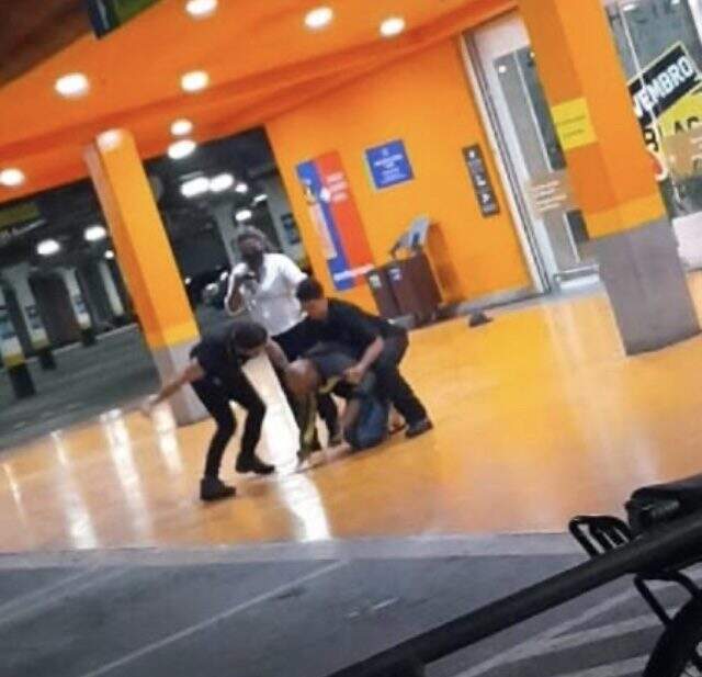 Nas imagens das câmeras de vigilância, é possível ver o homem, que é negro, sendo imobilizado e levando vários socos de dois seguranças. Os agressores foram presos. Um deles é policial militar temporário.