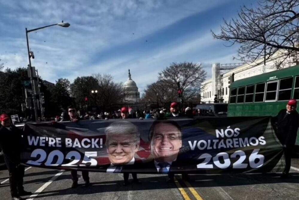 A faixa traz a frase, em inglês, “we’re back” – “nós voltamos”, em tradução livre – junto a uma imagem de Trump e “nós voltaremos”, em português, ao lado de uma imagem de Bolsonaro. O registro foi publicado nas redes sociais.