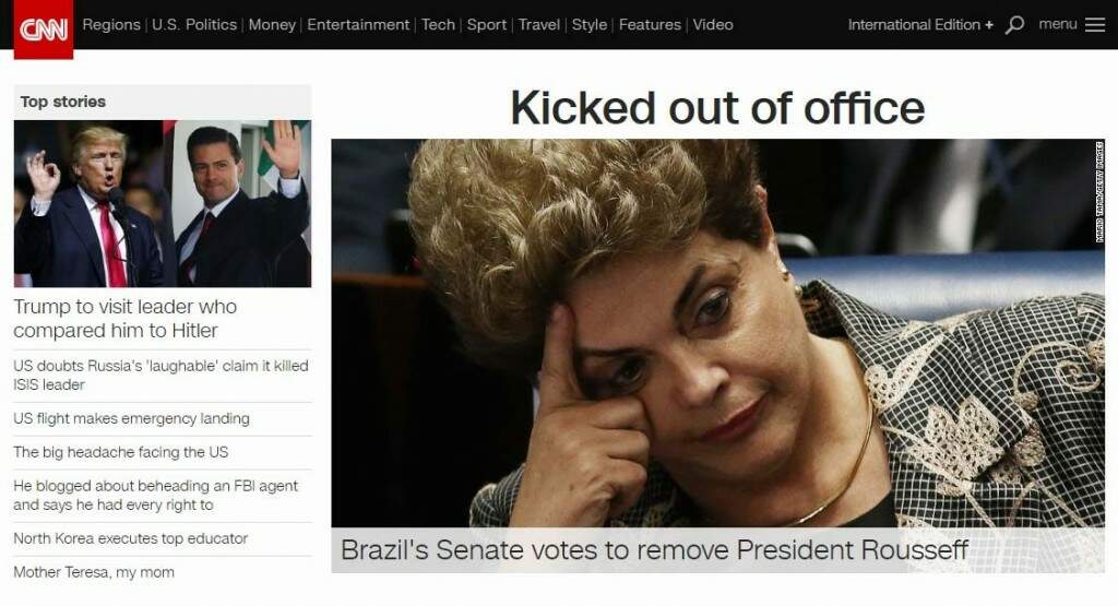A imprensa internacional destacou em seus sites a decisão desta quarta-feira do Senado brasileiro de afastar a presidente Dilma Rousseff. A rede norte-americana CNN deu grande destaque à notícia em seu site e afirma que a votação desta quarta marcou o culminar de um “processo polêmico que se arrastou por meses”. Também afirma que a decisão é “um grande revés” para Dilma, mas “pode não ser o fim de sua carreira política”.