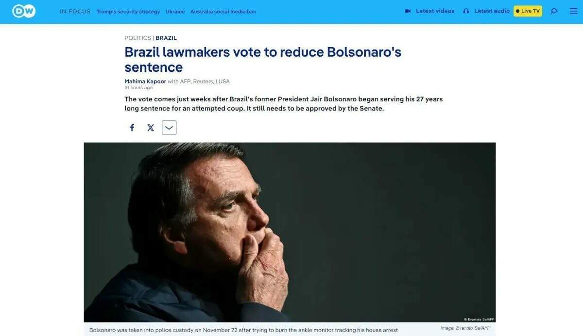 Foto: ReproduçãoA aprovação do “PL da Dosimetria” na Câmara dos Deputados foi destaque na imprensa internacional. O projeto de lei reduz as penas dos envolvidos na trama golpista e nos atos do 8 de Janeiro, incluindo do ex-presidente Jair Bolsonaro (PL).