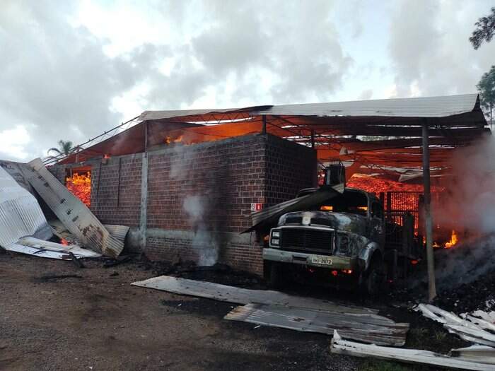 Um caminhão que estava na garagem da carvoaria ficou destruído
