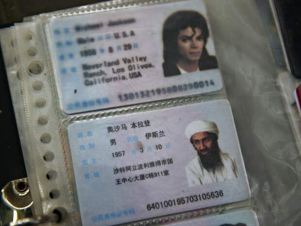 Carteiras de identidade caracterizadas com fotos do terrorista Osama bin Laden e do músico Michael Jackson, ambos mortos, foram flagradas à venda em uma calçada em Pequim, na China. Os “documentos” são vendidos por 1 iuane (cerca de o,50 real). (AG)