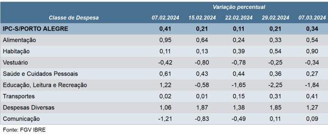 Os dados foram divulgados pela FGV (Fundação Getulio Vargas). Nesta apuração, quatro das oito classes de despesa componentes do índice apresentaram aceleração em suas taxas de variação, entre as quais se destacam os grupos educação, leitura e recreação e habitação, cujas taxas passaram de