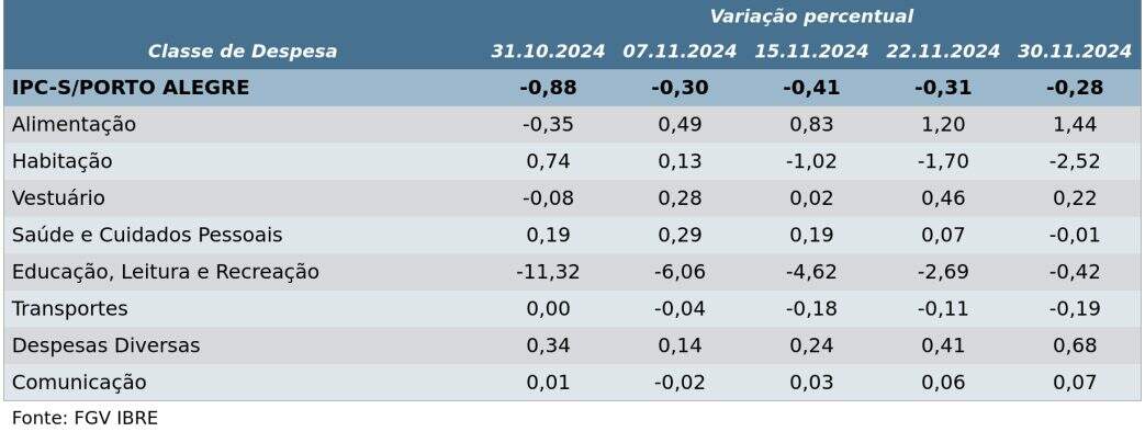 Apesar da taxa negativa, Porto Alegre foi a única entre as sete capitais pesquisadas pela FGV que registrou aumento no índice. Com o resultado, a inflação para o consumidor acumula alta de 3,04% nos últimos 12 meses na Capital gaúcha.