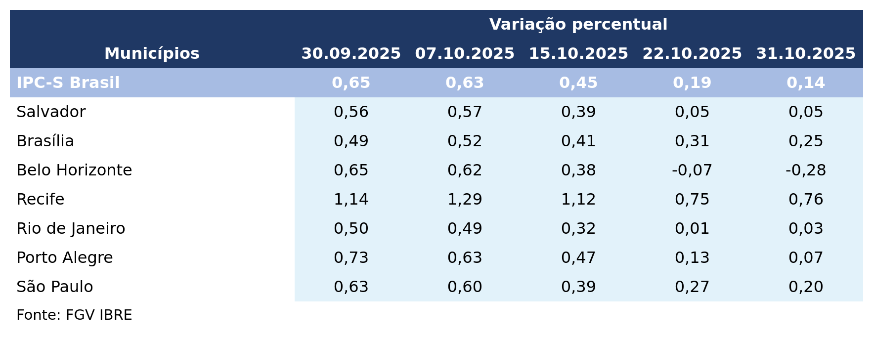 No País, o IPC-S caiu de 0,19% para 0,14%. Com o resultado, o indicador acumula variação de 3,60% nos últimos 12 meses.
