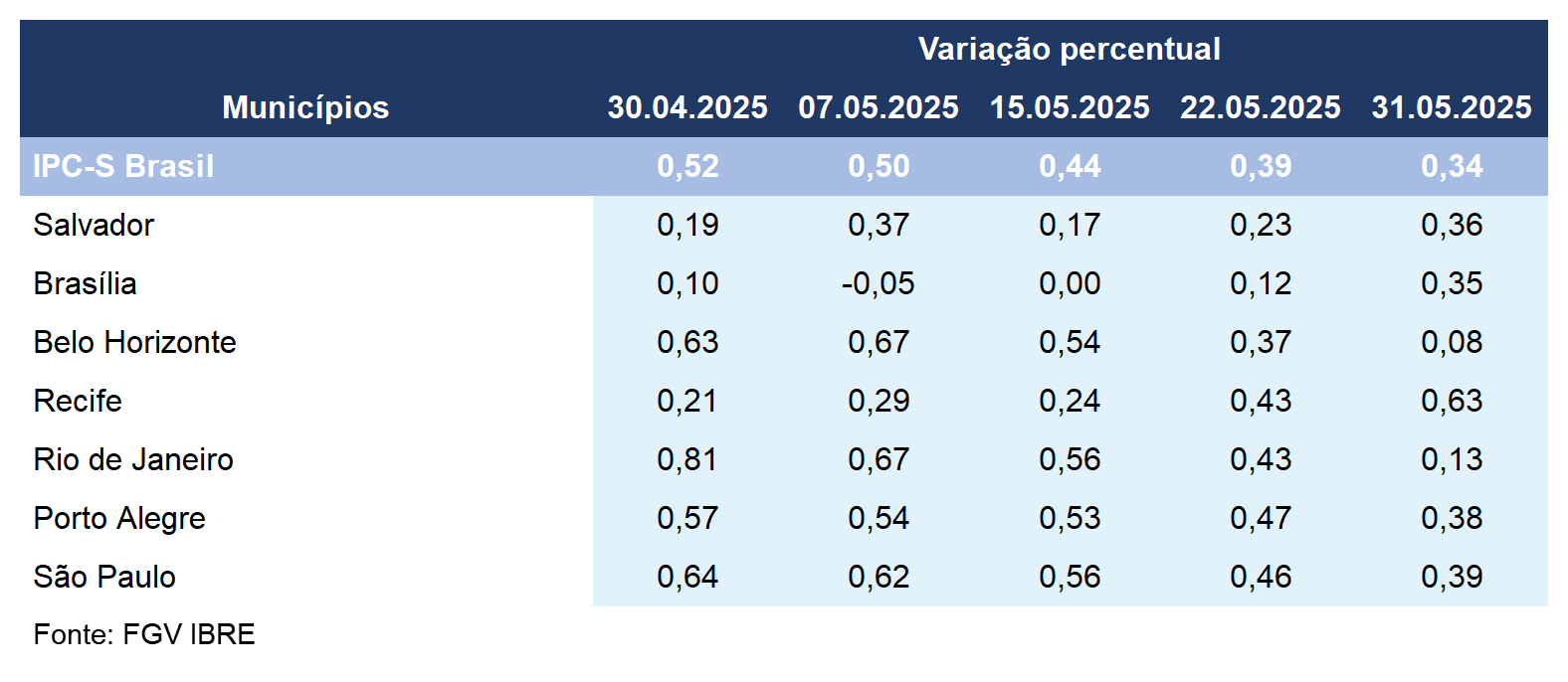O IPC-S (Índice de Preços ao Consumidor – Semanal) recuou de 0,47% para 0,38% em Porto Alegre na última semana de maio, de acordo com dados divulgados pela FGV (Fundação Getulio Vargas).