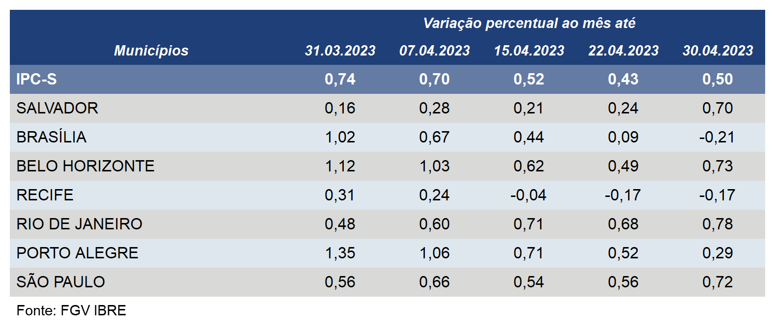 Além de Porto Alegre, o IPC-S caiu apenas em Brasília na quarta semana de abril, conforme a FGV.