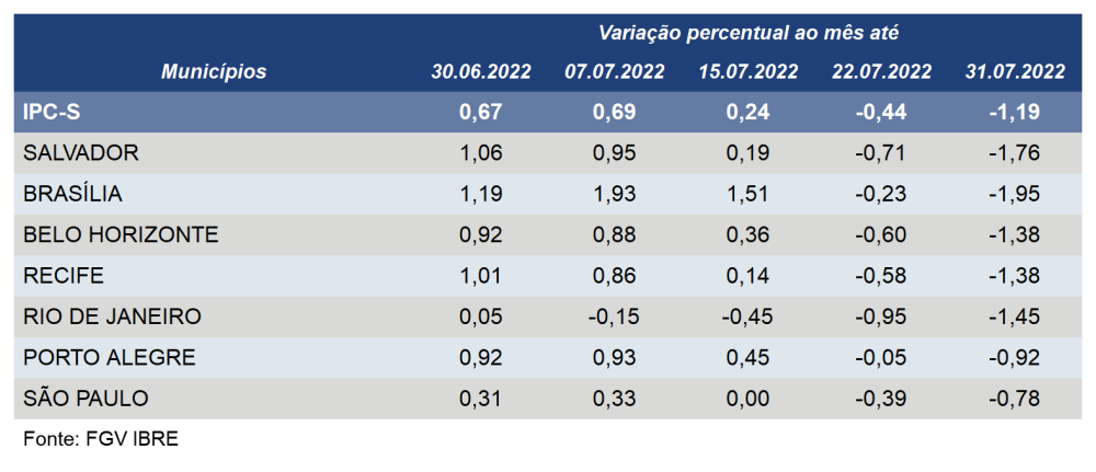 Foto: Marcello Casal Jr./Agência BrasilO IPC-S (Índice de Preços ao Consumidor – Semanal) recuou para -0,92% em Porto Alegre na quarta semana de julho. Na semana anterior, o índice havia ficado em -0,05%, segundo dados divulgados nesta terça-feira (02) pela FGV (Fundação Getulio Vargas).