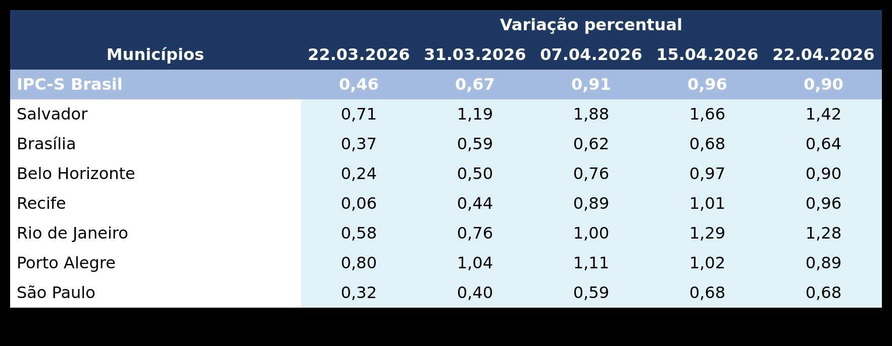 No País, o IPC-S caiu de 0,96% para 0,90%. Com esse resultado, o indicador acumula variação de 3,86% nos últimos 12 meses.