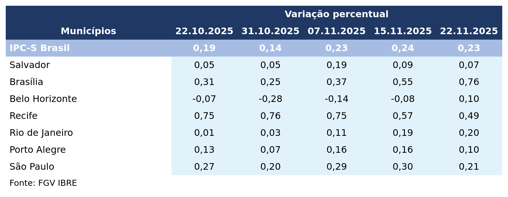 Houve aceleração do IPC-S em Brasília (0,55% para 0,76%), Belo Horizonte (-0,08% para 0,10%) e Rio de Janeiro (0,19% para 0,20%).