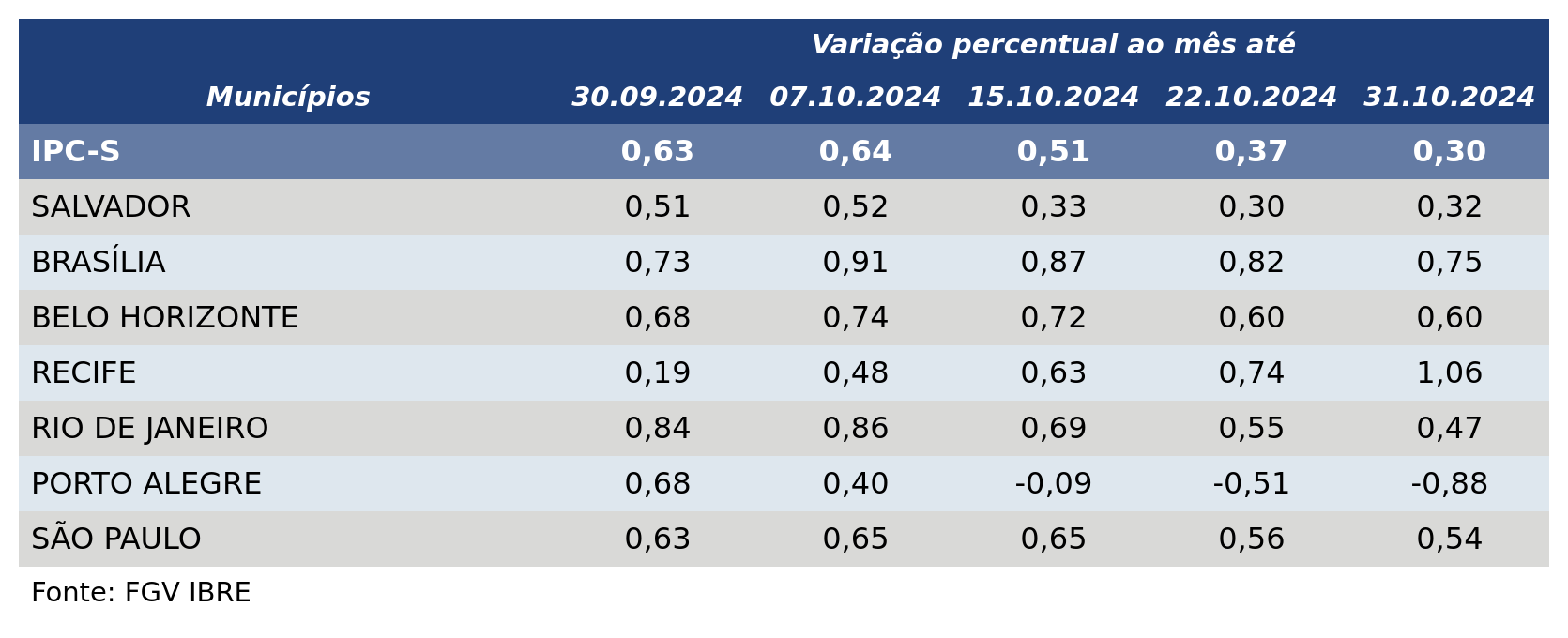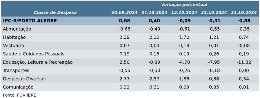 Além de Porto Alegre, o IPC-S caiu em outras três das sete capitais pesquisadas pela FGV na última semana de outubro.