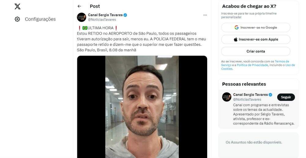 O influenciador português Sérgio Tavares, que recentemente entrevistou o ex-presidente Jair Bolsonaro (PL) em uma live em seu canal no YouTube, postou um vídeo em seu perfil no X (antigo Twitter) em que diz ter sido detido pela Polícia Federal (PF) no Aeroporto de Guarulhos (GRU) ao desembarcar no Brasil, na manhã deste domingo (25).