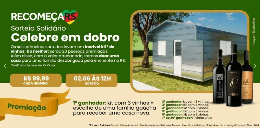 O objetivo agora é arrecadar, no mínimo, R$ 70 mil para custear um lar para uma família gaúcha, além de continuar auxiliando todos aqueles que estão em alojamentos, por meio do Projeto RecomeçaRS. Para isso, uma rifa de vinhos está sendo vendida online, a R$ 99 por bilhete/número. Serão seis ganhadores, sendo que o primeiro, além de levar um kit com três vinhos, indicará uma família desabrigada para receber a casa. Os outros cinco ganharão apenas o kit com três vinhos, ofertados pela Colório Vinhos Finos de Gramado. O sorteio acontecerá no domingo, dia 2 de junho, às 12h, pela plataforma utilizada para criar a rifa online.