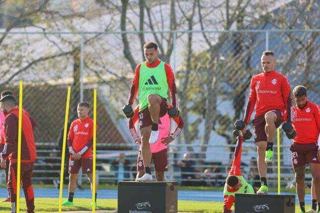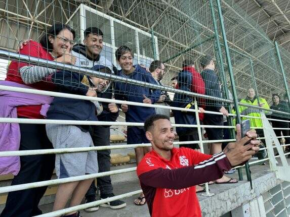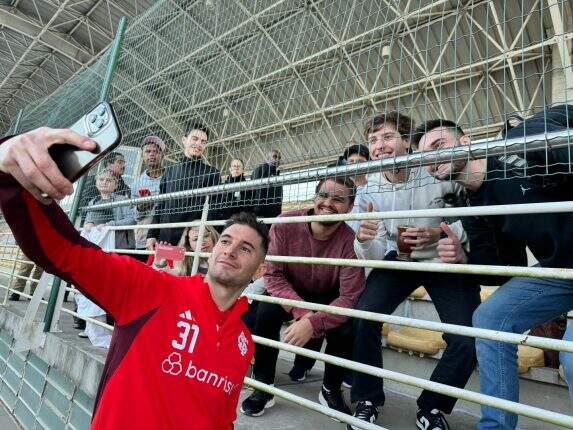 Foto: Ricardo Duarte/InternacionalO treino realizado pelo Inter na quarta-feira (15) contou com presença de público no Estádio da PUCRS. Pessoas que estão abrigadas no ginásio da Universidade e funcionários do Complexo puderam assistir das arquibancadas à atividade organizada pelo técnico Eduardo Coudet, e também tiveram a chance de interagir com os jogadores, tirando fotos e ganhando autógrafos, após a conclusão dos trabalhos.