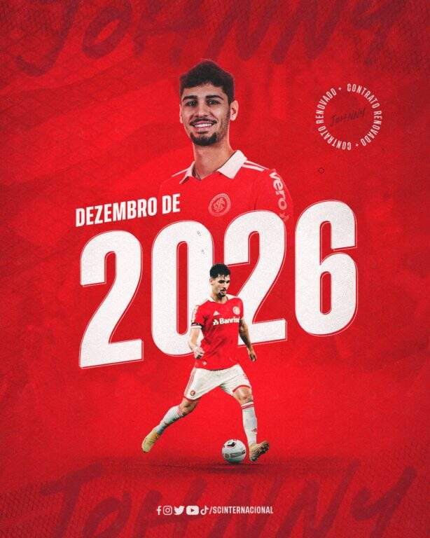 Foto: Divulgação/InterO Inter anunciou na tarde desta quarta-feira (15) a renovação do contrato de Johnny. O volante de 21 anos ampliou seu vínculo com o clube até dezembro de 2026. Destaque da base do Inter e com convocação para a seleção dos Estados Unidos no currículo, Johnny estreou como profissional do clube em 2020, quando tinha 17 anos.