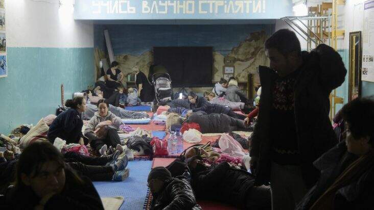 Centenas de moradores de um prédio residencial danificado por um míssil se reúnem em um abrigo antibomba no porão de uma escola em Kiev, em 25 de fevereiro de 2022.