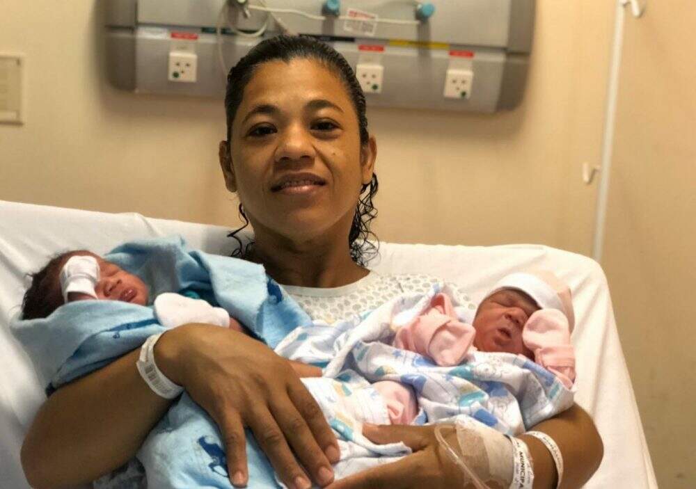 A mamãe chegou ao hospital às 23h10min, já em trabalho de parto, e seguiu direto para o Centro Obstétrico. Prematuras de 35 semanas de gestação, as crianças nasceram de cesariana, na presença do pai, Rodrigo Faustino da Silva.