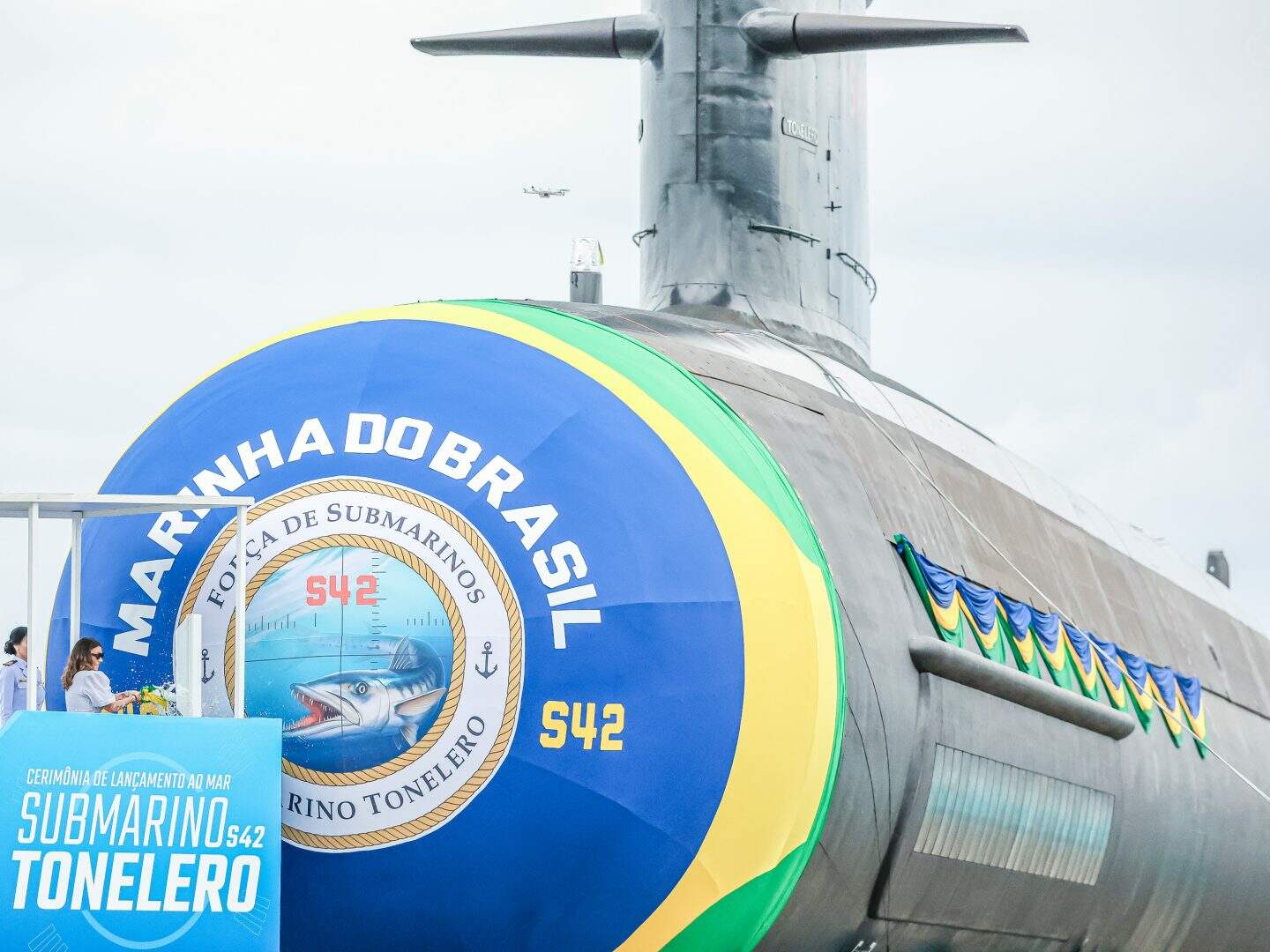 Mantendo a tradição do meio naval, Janja quebrou uma garrafa de espumante no casco do submarino. Trata-se de uma simbologia para transmitir sorte e proteção aos marinheiros que usarão o Tonelero.