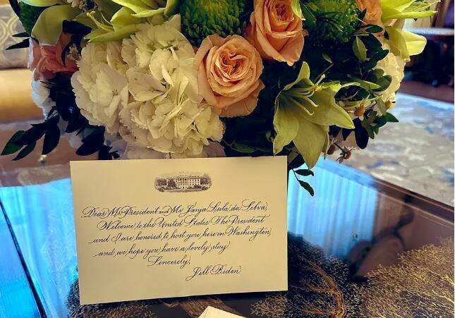 Mais cedo, a primeira-dama Janja publicou nas redes sociais uma foto com o buquê de flores e o bilhete que Jill Biden enviou a ela e a Lula. Na pequena carta, a esposa de Joe Biden deseja boas vindas à comitiva brasileira.
