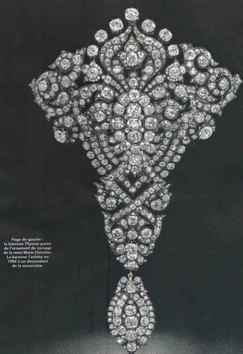 O leilão que a Maison Christie’s realiza nesta quarta-feira (13),  em Genebra,  tem um fabuloso ornamento de diamantes, que vocês podem conferir na foto, inicialmente propriedade da Rainha Maria Christina, esposa do Rei Afonso XII da Espanha, no século 19. A joia fez parte dos presentes recebidos do marido, por ocasião do casamento, e posteriormente seus herdeiros venderam a terceiros. Atualmente, pertence à baronesa Thyssen, que colocou à venda na importante casa de leilões. Um detalhe curioso: este tipo de joia, usado sobre os corpetes nos séculos 18 e 19, em sua maioria, foi montado com brilhantes originários do Brasil. Os experts da Christie’s não divulgaram o valor inicial atribuído ao bijoux, que deve montar a vários milhões de Euros.