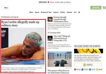 Em letras garrafais, o “Boston Globe” também dá destaque ao fim da trama criada pelos atletas: “Polícia do Brasil afirma que Ryan Lochte inventou história de assalto”.