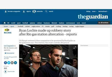 O britânico “The Guardian” cita uma briga envolvendo os americanos e um segurança do posto, localizado na Barra da Tijuca, e também uma declaração inicial do diretor de Comunicação da Rio 2016, Mario Andrada, em que ele argumenta que os nadadores “se divertiram, erraram, mas a vida continua”.