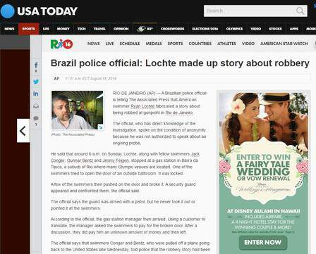 Já o jornal “USA Today” é ainda mais taxativo: “Polícia brasileira: Lochte inventou história sobre assalto”.
