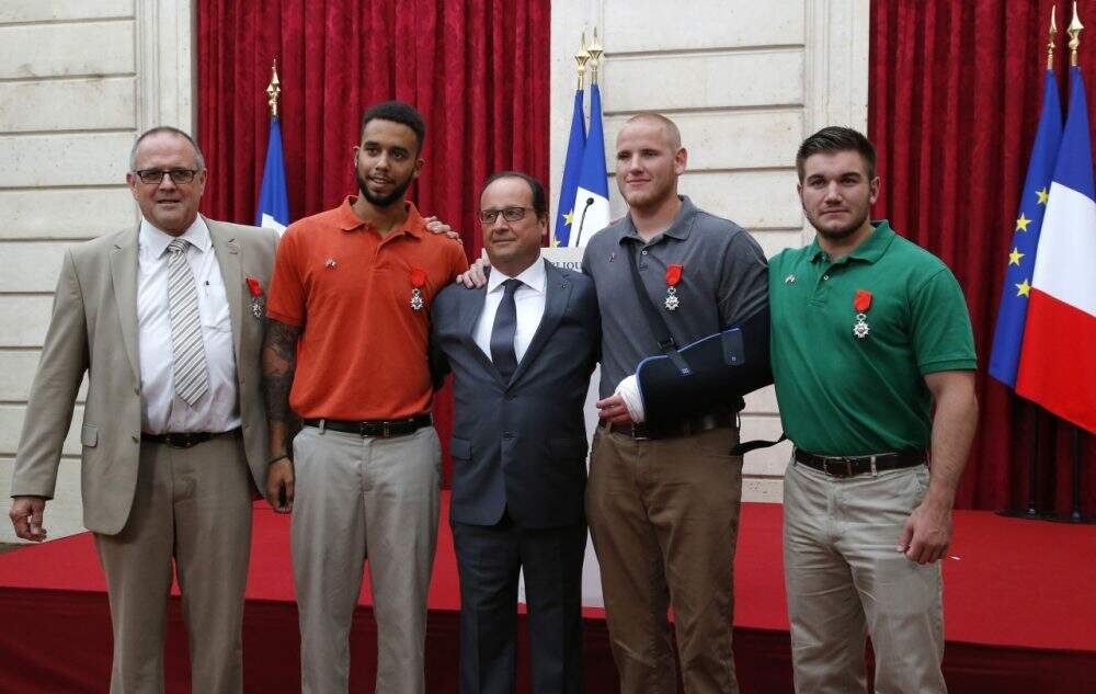 O presidente da França, François Hollande, concedeu nesta segunda-feira (24) a Legião de Honra aos três jovens norte-americanos e ao britânico que neutralizaram na sexta-feira (21) Ayoub El-Khazzani no momento em que o marroquino tentava abrir fogo com um fuzil em um trem lotado de passageiros.