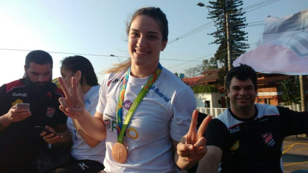A judoca Mayra Aguiar, que conquistou a medalha de bronze nos Jogos Olímpicos do Rio de Janeiro, desembarcou no Aeroporto Internacional Salgado Filho, em Porto Alegre, na tarde desta terça-feira (16). A atleta da Sogipa foi recepcionada por fãs, colegas de treino e dirigentes do clube. A jovem foi conduzida em carro aberto pelas ruas de Porto Alegre.