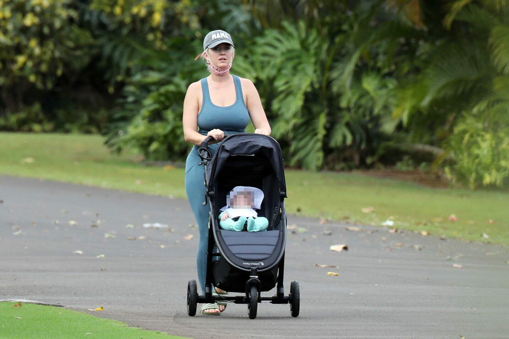 Foto: ReproduçãoKaty Perry foi clicada com sua filha, Daisy Dove, pela primeira vez durante uma viagem em família ao Havaí, nos Estados Unidos. Com um look de ginástica, ela foi vista passeando com a pequena em um carrinho. O rostinho da menina foi borrado pela agência de fotos.