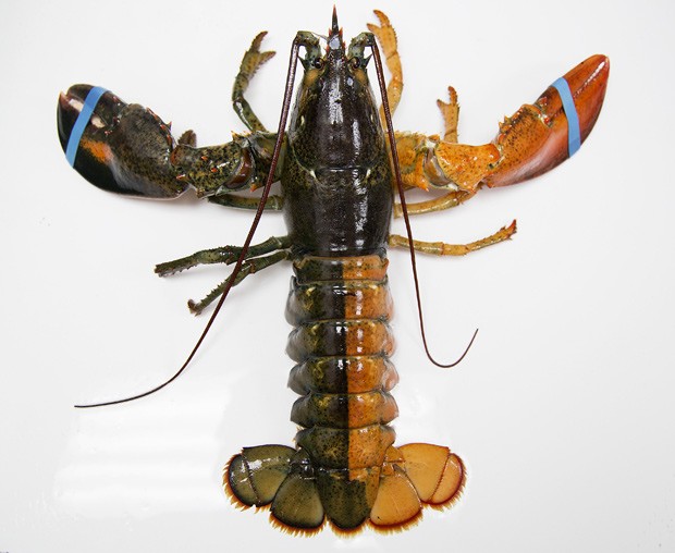 Uma lagosta muito incomum foi encontrada recentemente no litoral do estado do Maine, nos Estados Unidos. A lagosta metade laranja e metade marrom chegou na semana passada na Cooperativa de Pescadores Pine Point. Não se sabe quem a pescou.