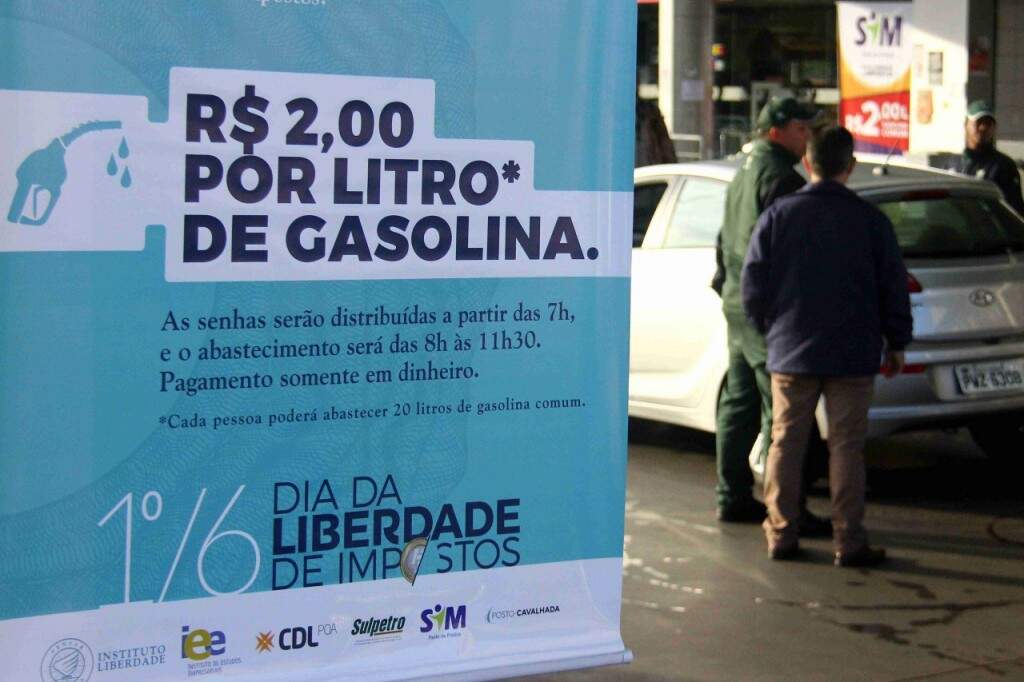 Motoristas fazem longas filas para abastecer mais barato no Dia da Liberdade de Impostos, promovido nesta quarta-feira (01) em Porto Alegre, Gravataí, Caxias do Sul e Pelotas. O litro do combustível é vendido a R$ 2 em alguns postos.