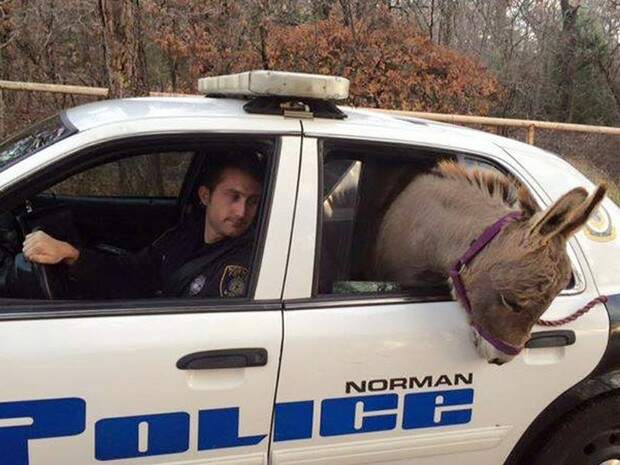 Burro foge e ganha “carona” na viatura da polícia